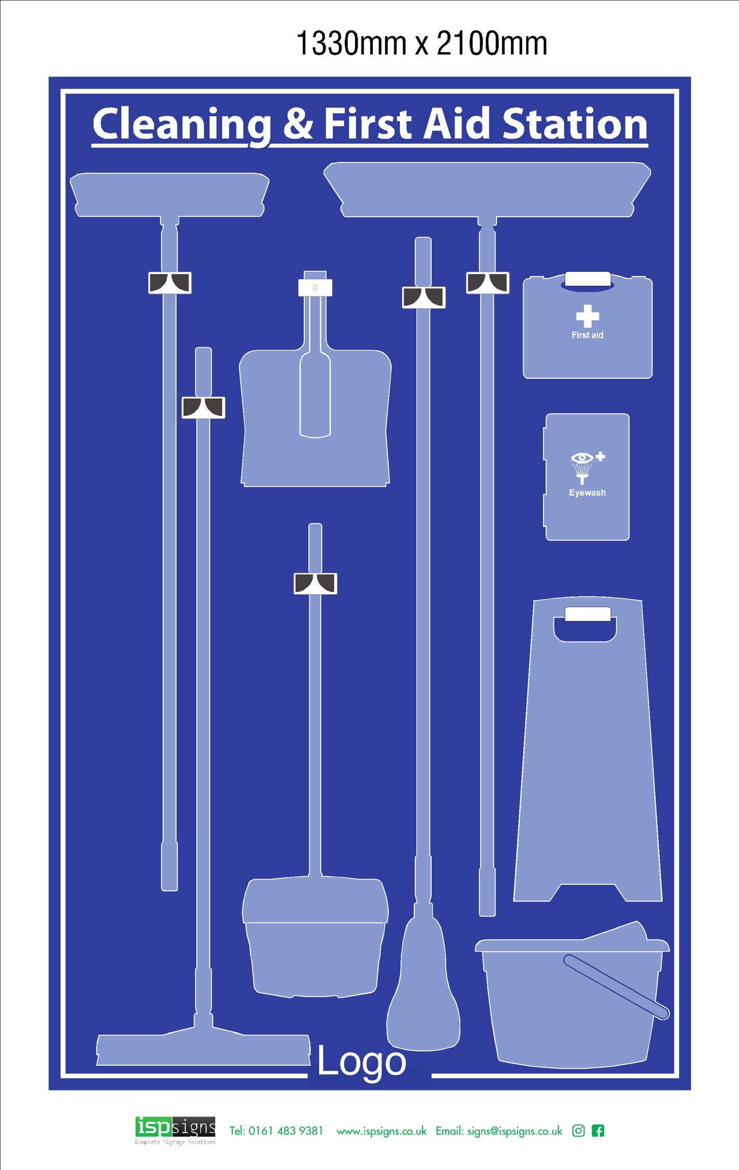 XL - Extra Large cleaning station and first aid shadow board kit, made from aluminum composite panel, laminated full colour digital print, plastic or steel hook options.